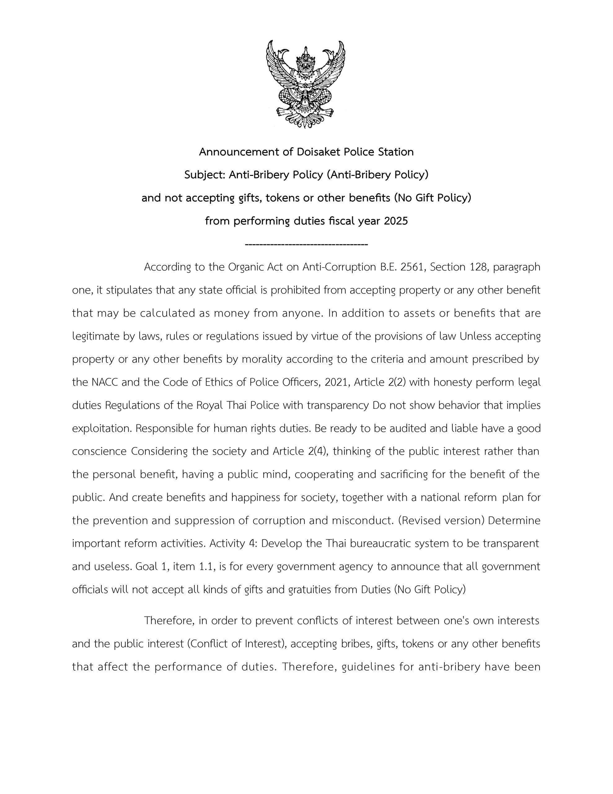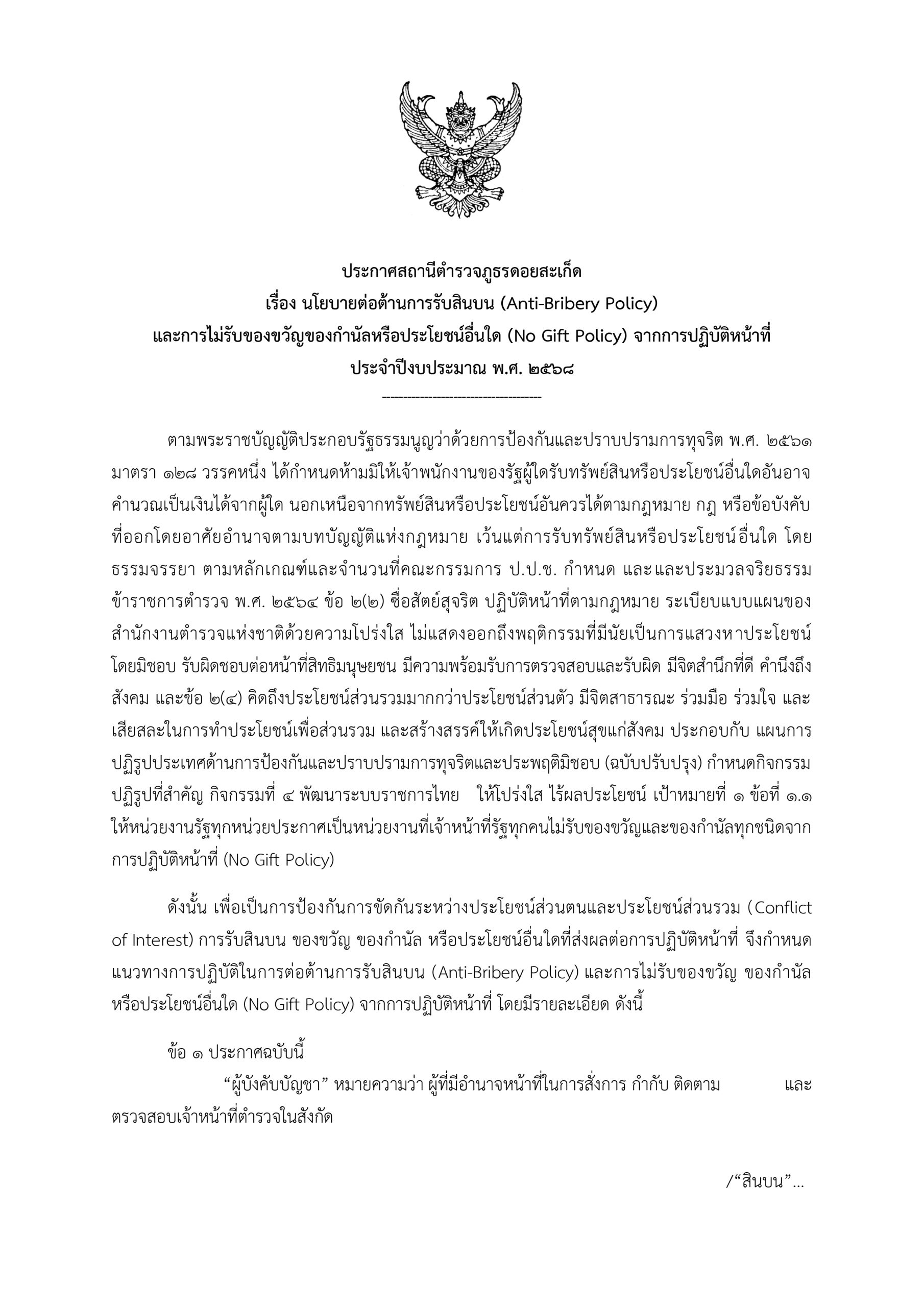 การประชุมขับเคลื่อนการประเมินคุณธรรมและความโปร่งใส ในการดำเนินงานของหน่วยงานภาครัฐ (Integrity &Transparency Assessment: ITA) ของสถานีตำรวจ ประจำปีงบประมาณ พ.ศ. 2568